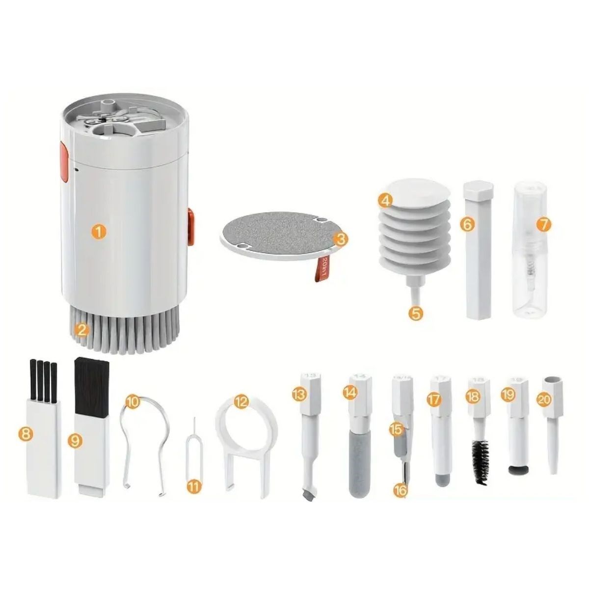9. Fırça Uçlu Temizlik Aparatları (13-20): Set, fırça uçlu aparatlar ile zenginleştirilmiştir. Çeşitli boyutlarda ve yapıda olan bu fırçalar, farklı yüzeylerde ve cihazlarda derinlemesine temizlik sağlar. Örneğin, kalın fırçalar geniş yüzeylerde, ince fırçalar ise dar alanlarda kullanıma uygundur.