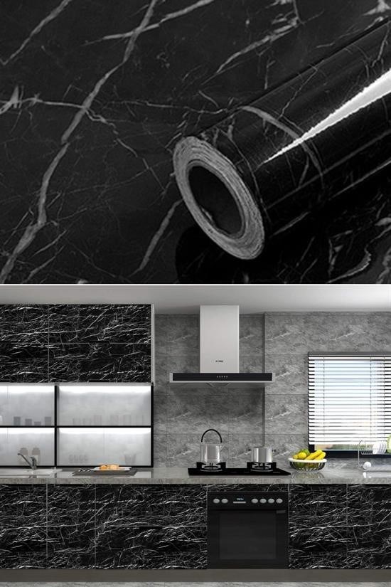 Buffer Mermer Desenli Masa Tezgah Mutfak Duvar Kağıdı Su Geçirmez Yapışkanlı Folyo Sticker Siyah 5x0,6m