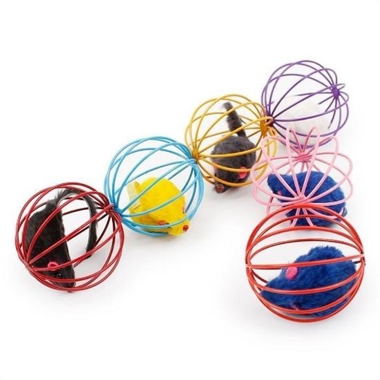 Buffer® Renkli Metal Kafesli Peluş Fareli Kedi Köpek Oyuncağı Oyun Topu 6 cm